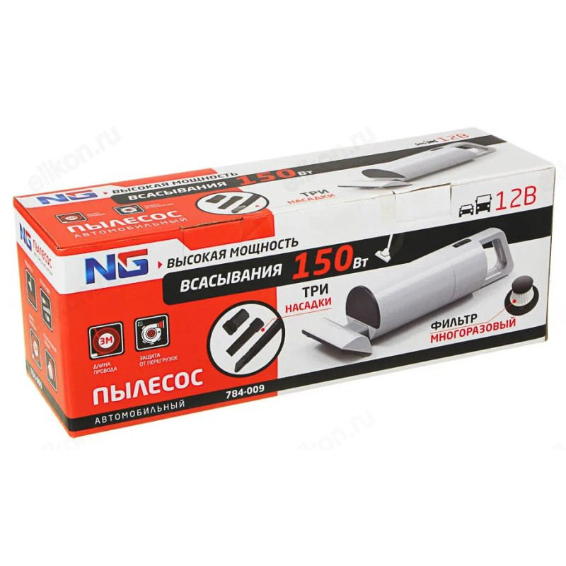 NG Пылесос автомобильный, 150Вт, 2 насадки, сухая и влажная уборка, провод 3м, 12В