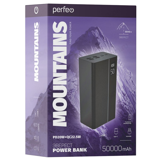 Power Bank 50000 Perfeo MOUNTAINS, 50000 mAh, черный