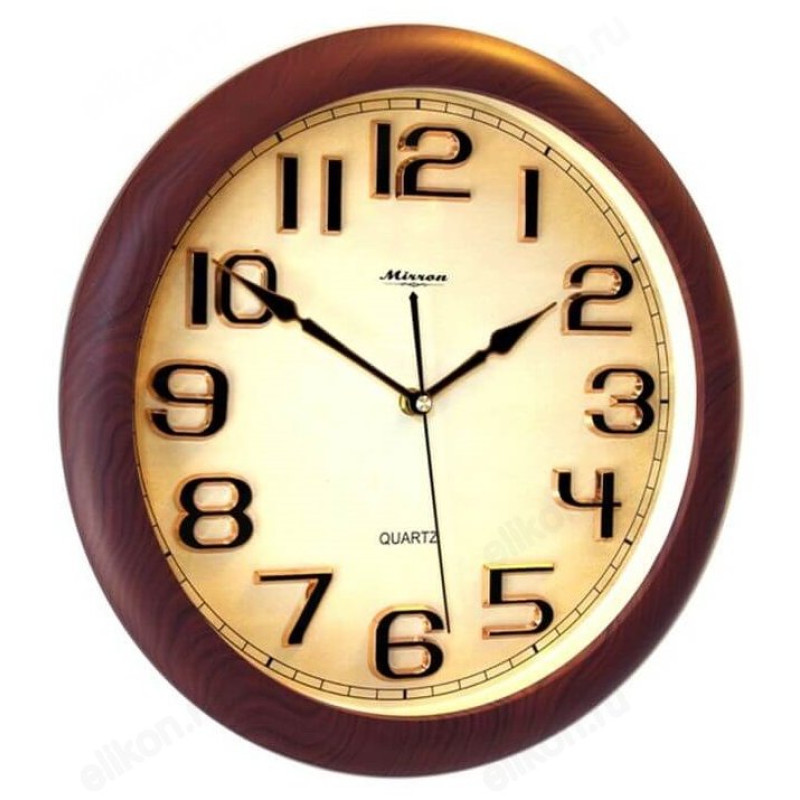 Кварцевые часы от бренда Mirron имеют пластиковый корпус круглой формы с плавным ходом.