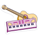Музыкальные инструменты: гитары, синтезаторы и укулеле, а также необходимые для них принадлежности (металлические и нейлоновые струны, держатели для гитары, медиаторы и т. д.).