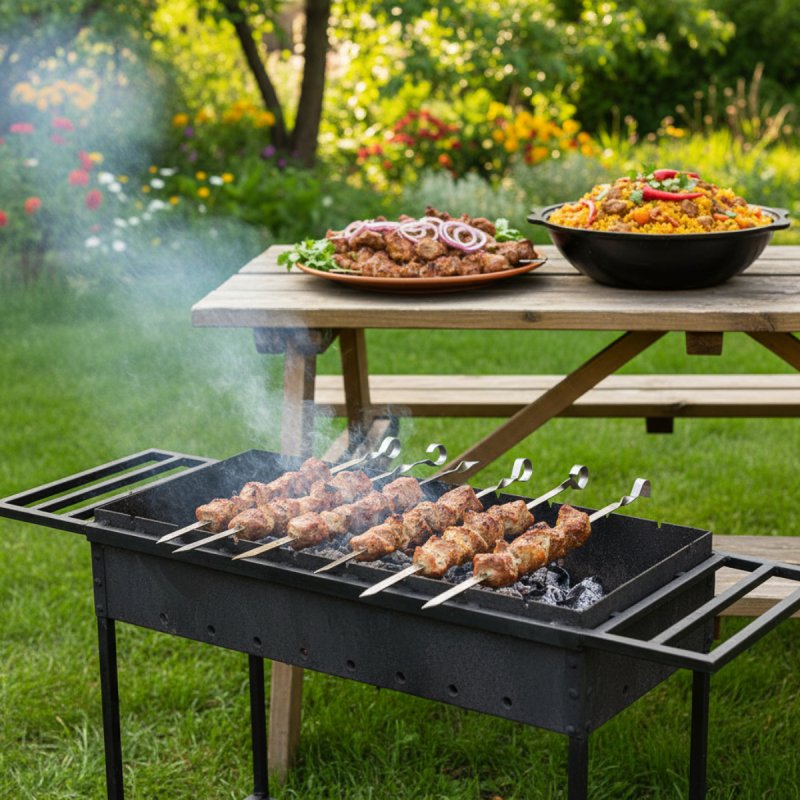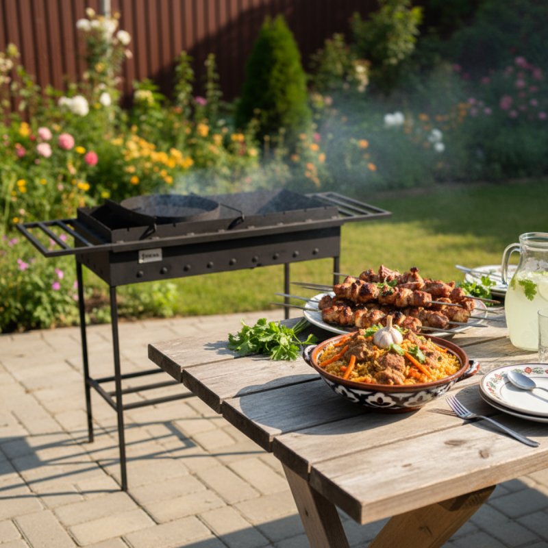 Просто пушечный мангал , сталь плотная , держатель для казана , выдвижные мини полочки по бокам , уже попробовали в использовании и не пожалели ,очень рады покупкой