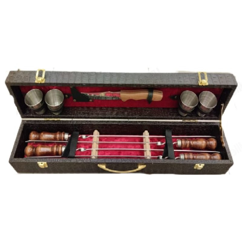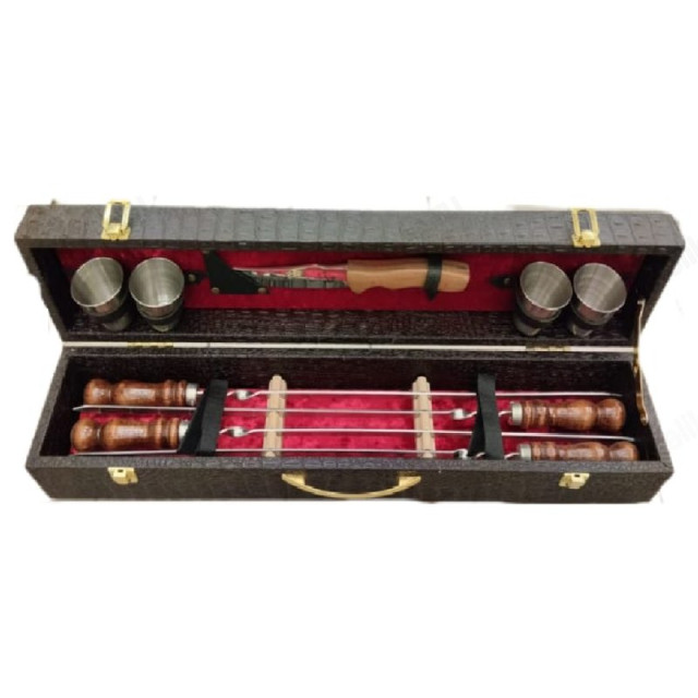 В этом наборе: подарочный чемодан, 4 шампура, 4 рюмки, нож.