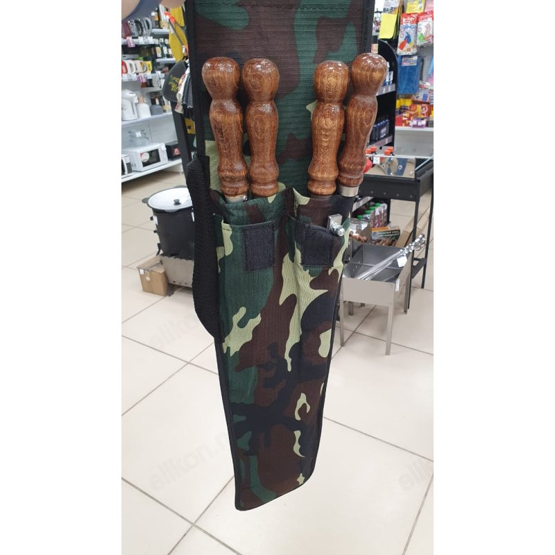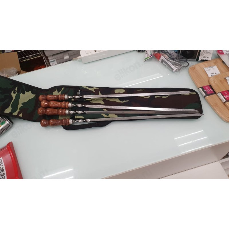 Набор шампуров для туриста Мини - оптимальный минимум. Чехол из крепкой ткани, 4 шампура из нержавеющей стали с деревянной рукояткой, кочерга и кронштейн для шампуров.