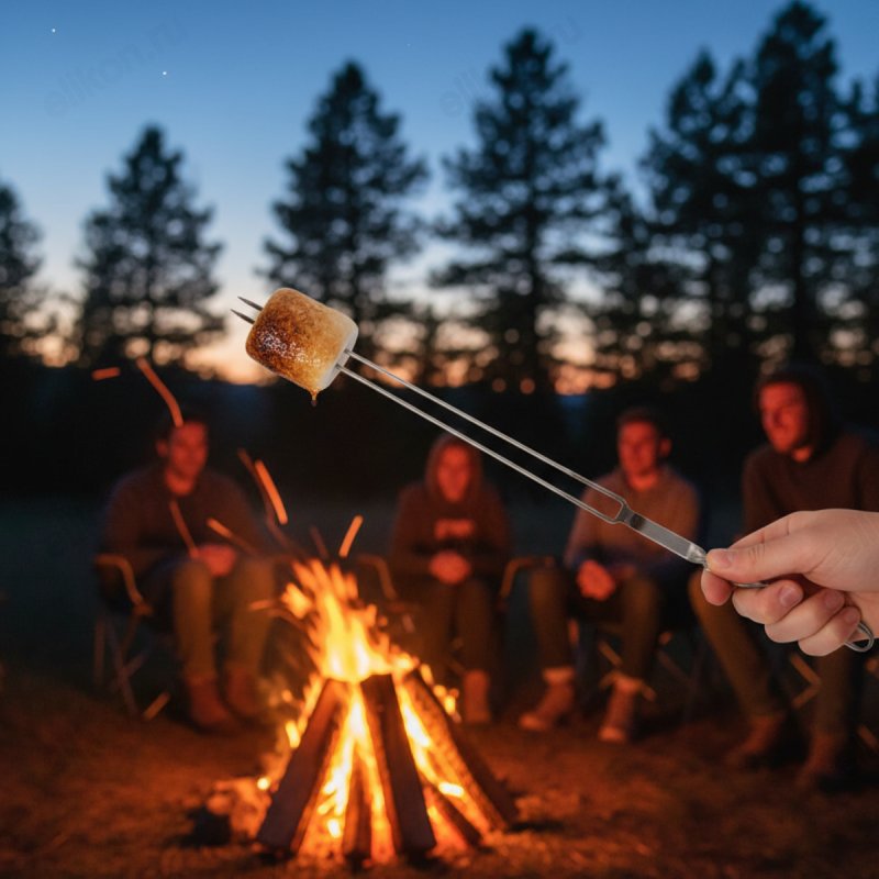 Вилка предназначена для жарки грибов, овощей или других продуктов на открытом огне или углях, изготовлена из стали.