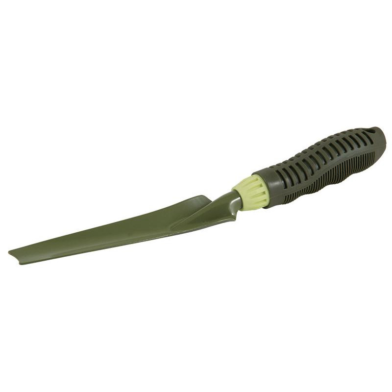 углеродистая сталь, ручка эластичная пластмасса, рабочая часть 21.3х5х3см, параметры ручки 12.7х4х4см, толщина стали 1.8мм