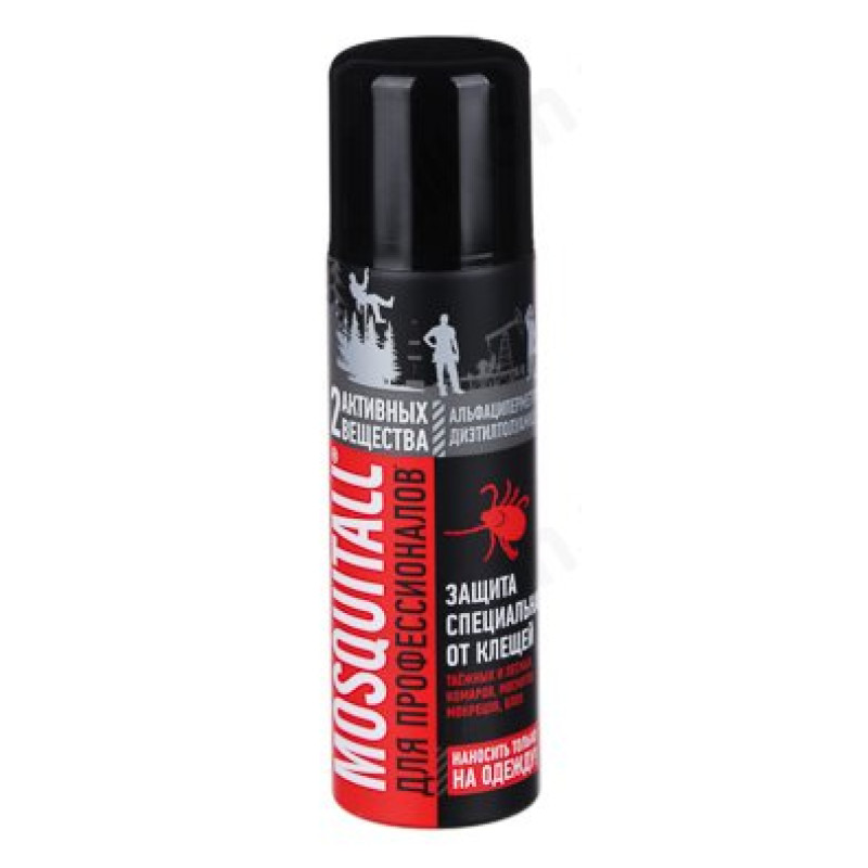 Аэрозоль Mosquitall «Защита от клещей» – это специальное профессиональное средство для защиты от кровососущих насекомых, которое незаменимо во время туристических походов, рыбалки и охоты в экстремальных условиях, в поездках на природу и на дачу. 2 активных вещества – альфациперметрин и диэтилтолуамид эффективно отпугивают и клещей, а также таежных и лесных комаров, москитов, мокрецов, слепней и блох. Предназначен для нанесения на одежду. Работает до 10-15 дней.