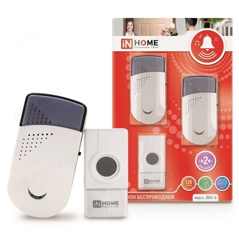 Звонок беспроводной ЗБН-6, 32 мелодии, 2 динамика, 120м, с кнопкой IP44, бело-серый IN HOME