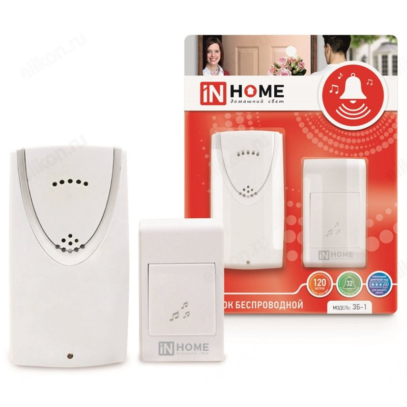 Звонок беспроводной ЗБ-1, 32 мелодии, 120м с кнопкой, белый IN HOME