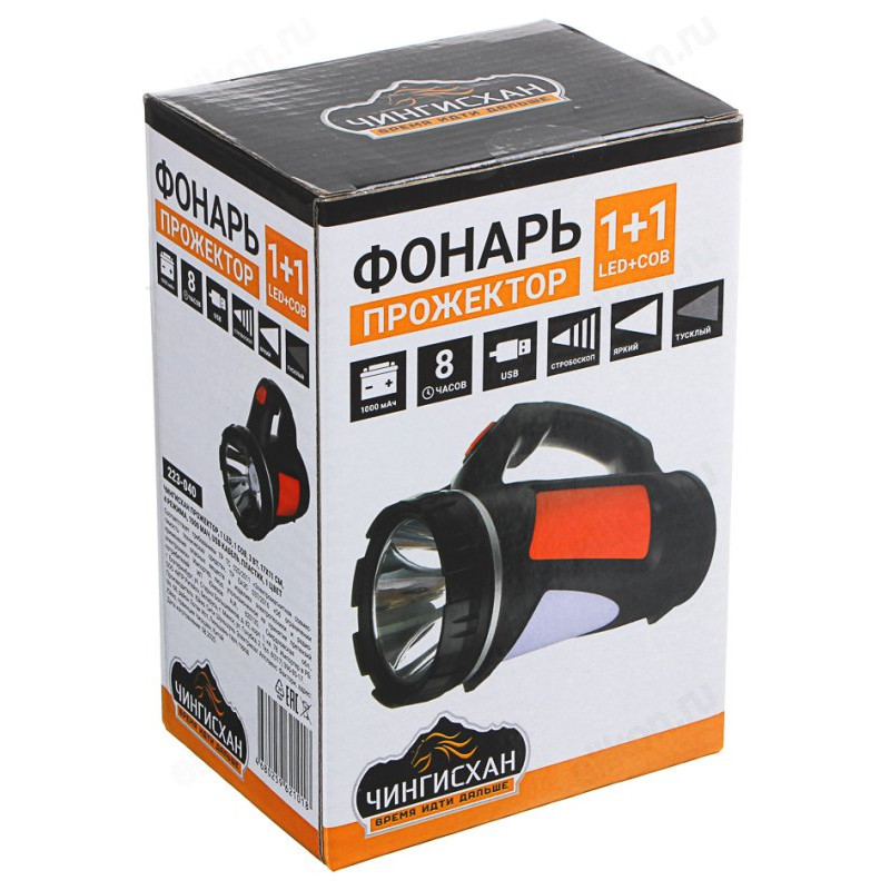 8 причин купить фонарь прожектор Чингисхан:• встроенная аккумуляторная батарея на 1000 мАч • обеспечивает 8 часов беспрерывного свечения• подзарядка фонаря прожектора через USB шнур• 3 режима свечения — яркий, тусклый, стробоскоп• эргономичная ручка — удобно держать в руке• держите дома, чтобы использовать при отключении электричества• берите с собой в поход и на ночевку в лесу, пригодится на рыбалке• храните в багажнике автомобиля, чтобы в экстренной ситуации не остаться без света.