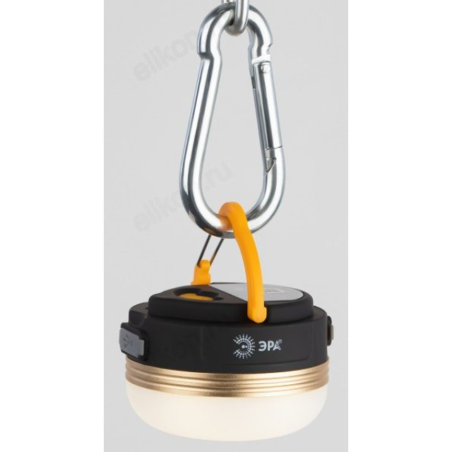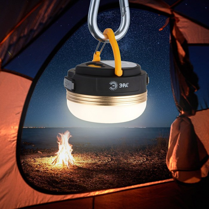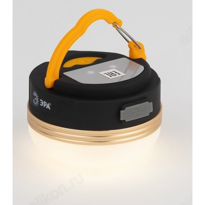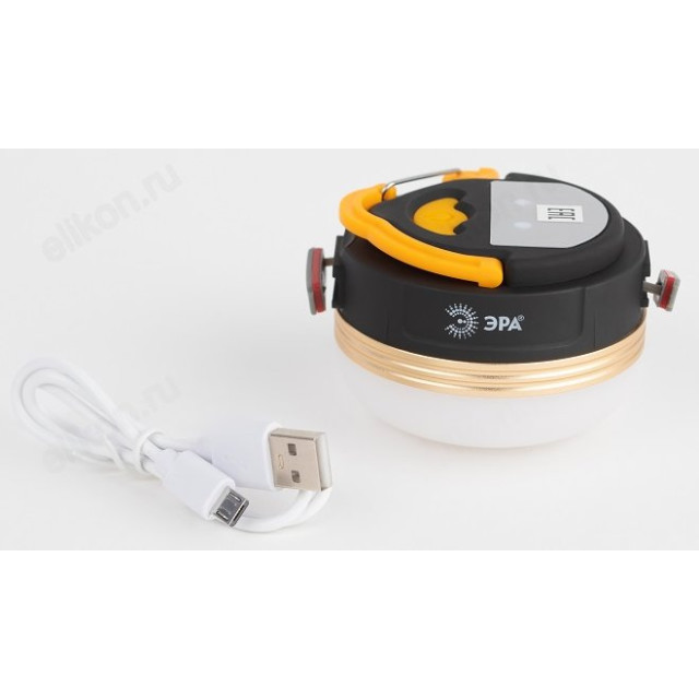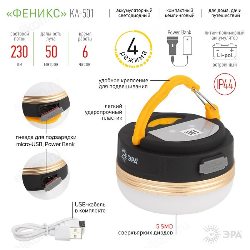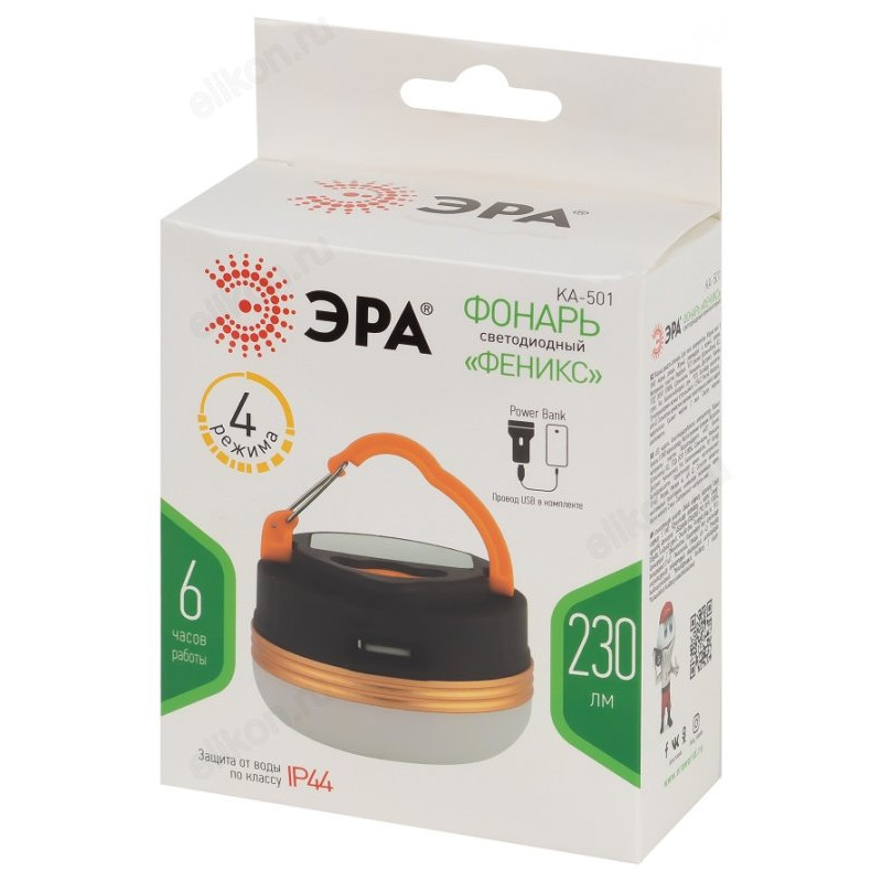 ЭРА KA-501 "Феникс" - компактный кемпинговый фонарь с удобным креплением для подвешивания. Работает от встроенного аккумулятора, USB-кабель для подзарядки в комплекте. Яркий качественный свет создают 5 светодиодов нового поколения. Эргономичный круглый корпус изготовлен из легкого ударопрочного пластика. Одной подзарядки хватает на 6 часов непрерывного свечения. Несмотря на малый размер, отличается хорошим световым потоком - 230 Лм. В зависимости от ситуации выбирайте режимы работы: 1) 100% яркость, 2) 50% яркость; 3) стробирование; 4) SOS. Мощность этого удобного фонарика - 3 Вт. Важное преимущество - фонарь можно использовать как powerbank, подзаряжая от него мобильные устройства. После полной подзарядки непрерывно светит 6 часов. Кемпинговый фонарик ЭРА "Феникс" защищен от влаги и пыли (IP44), он обеспечит вас надежным освещением в любую погоду!