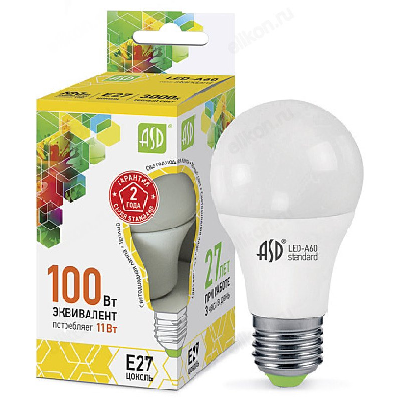 Лампа светодиодная LED E27 A60 11W 3K 230V 990Лм ASD