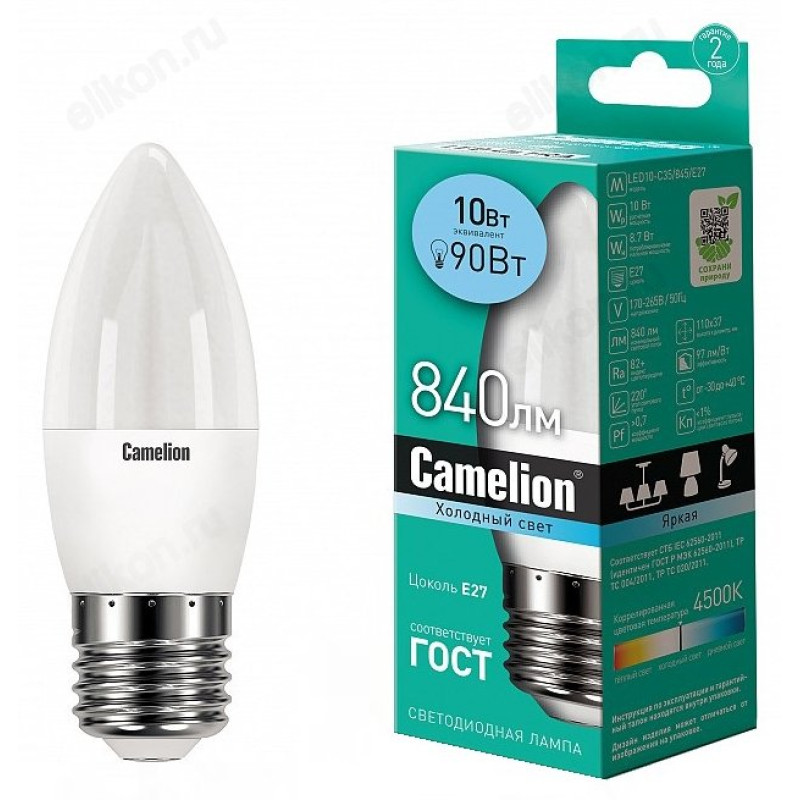 Лампа светодиодная LED E27 C35 10W 4K Camelion Свеча 845-10/27