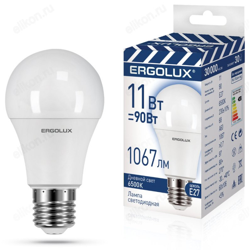 Лампа светодиодная LED E27 A60 11W 6K Ergolux 14724