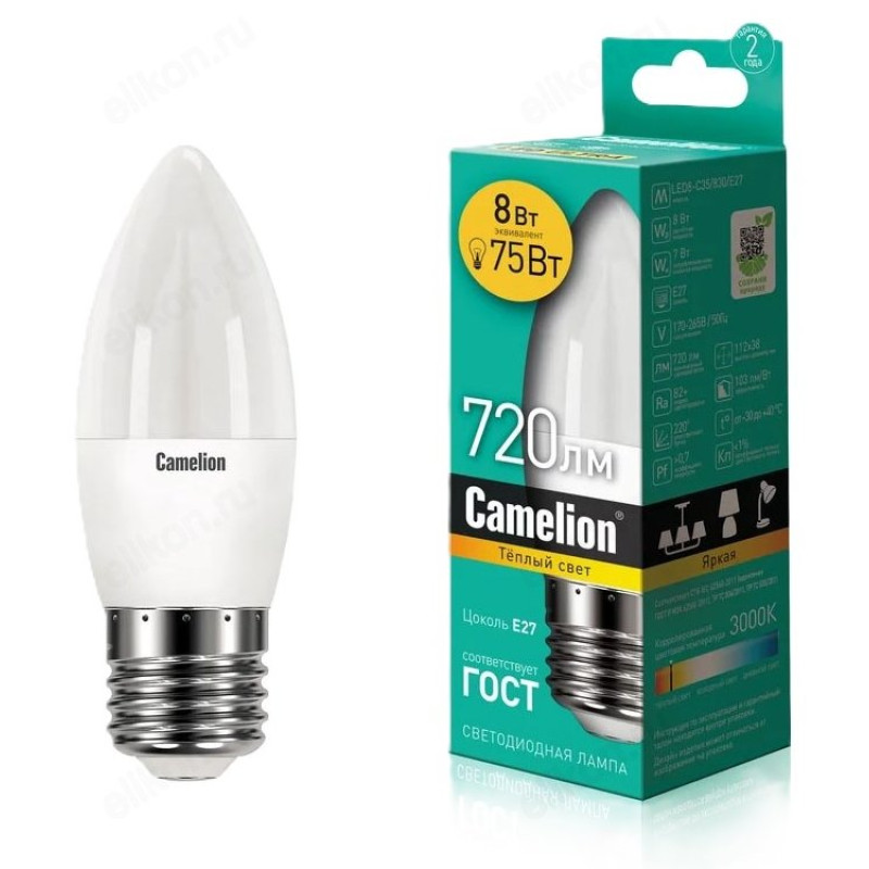 Лампа LED E27 C35 Camelion Свеча 38795 8/830/E27