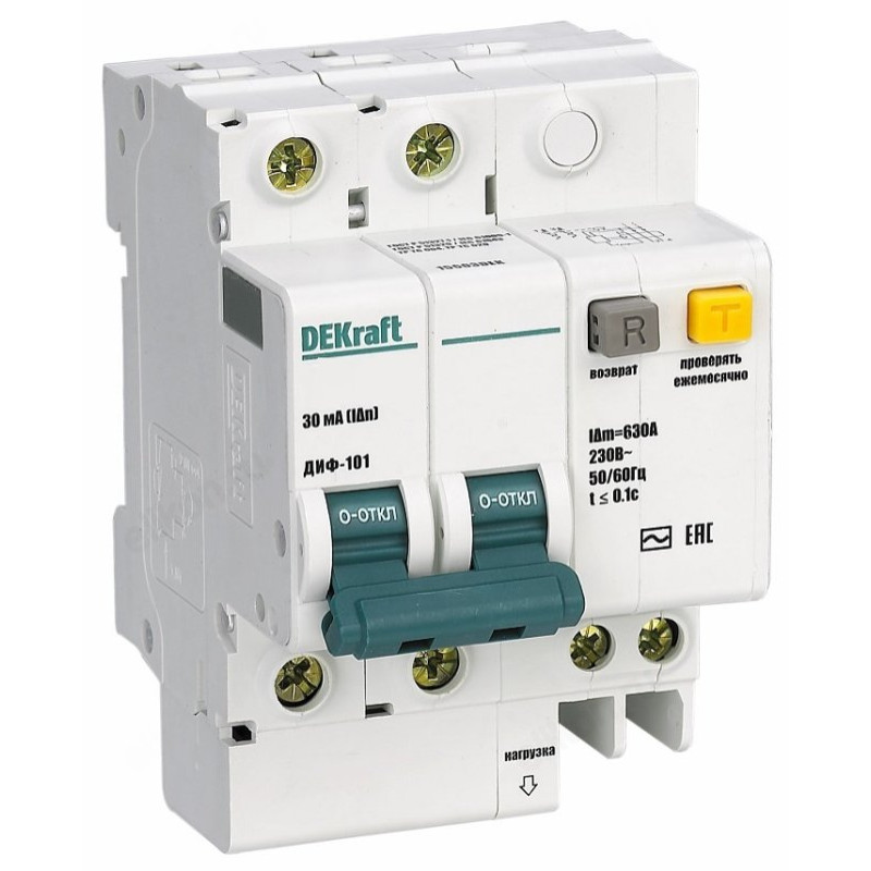 Автоматический выключатель дифференциального тока серии ДИФ-101 DEKraft; 1P+N; ном.ток 25 А; характеристика C; откл.способность Icn = 4, 5 kA; ток утечки 30 мА; блок дифф.защиты – электронный; ширина – 2, 5 мод. х 18 мм; монтаж – на DIN-рейку. АВДТ применяются в сетях напряжением до 220 В пер.тока для защиты электроустановок от сверхтоков и токов утечки. Для расширения функционала АВДТ возможно использование аксессуаров от выключателей серии ВА-101.