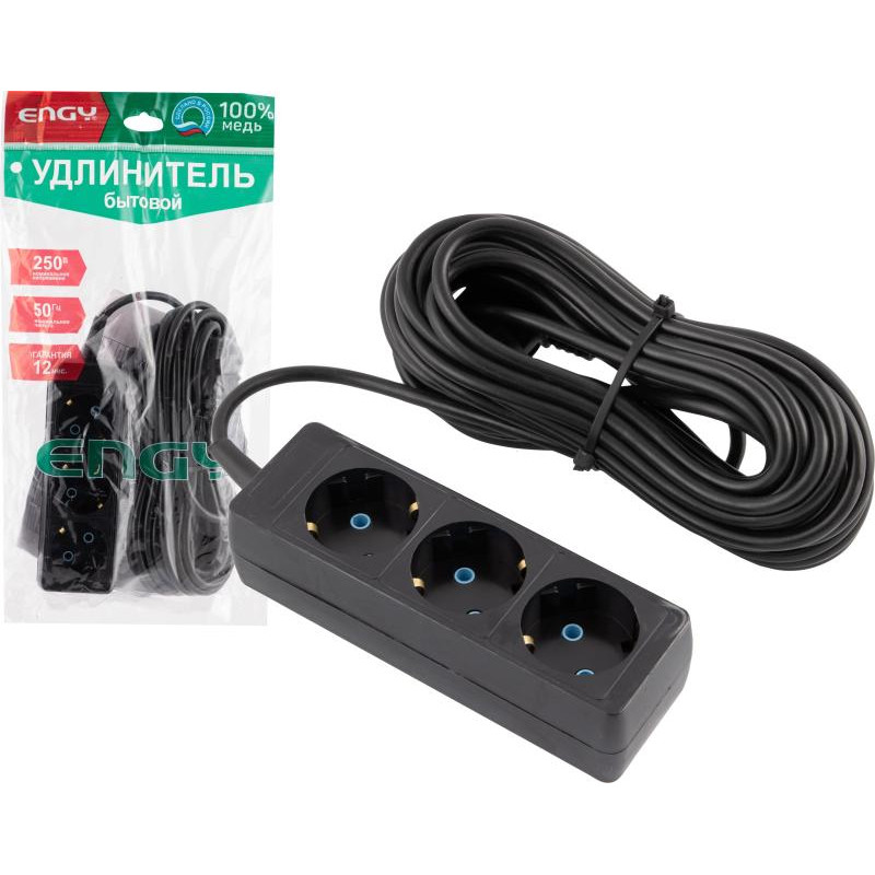 Удлинитель Engy 'Гранд' 10м/3роз с заземлением (ПВС 3х0.75) черный ENERGY 186737