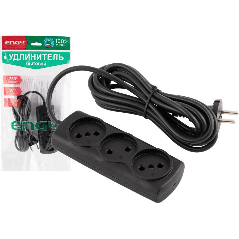Удлинитель Engy 'Премиум' 3м/3роз (ПВС 2х0.75) черный ENERGY 186743