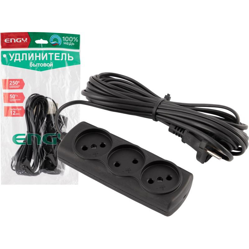 Удлинитель Engy 'Эконом' 10м/3роз (ШВВП 2х0.75) черный ENERGY 186750