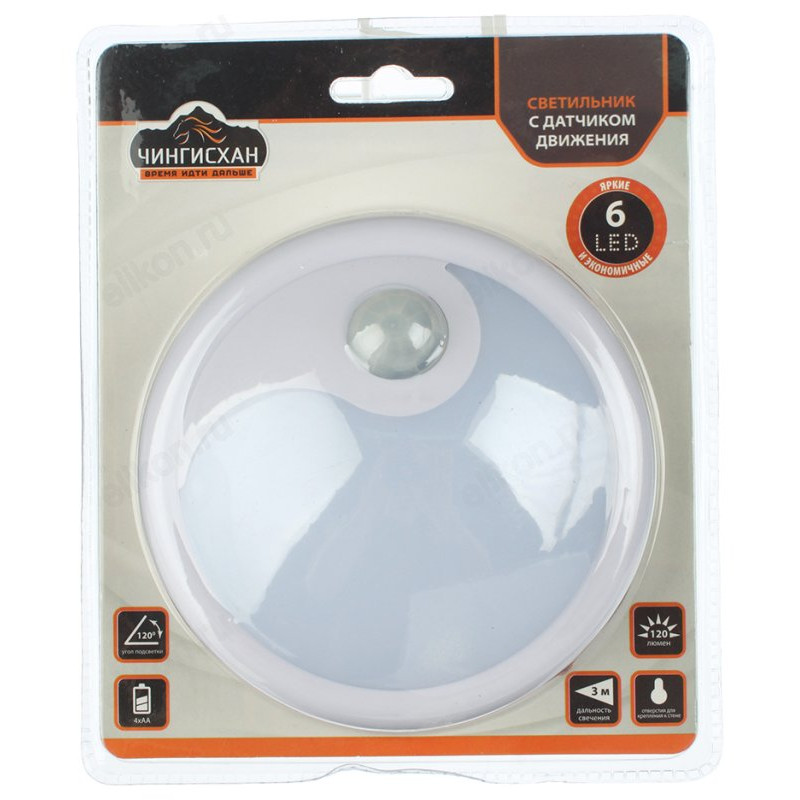 5 причин купить светильник с датчиком движения Чингисхан: • экономия электроэнергии — включается только когда в зоне действия появляется движение • удобно и безопасно возвращаться домой в темное время суток — фонарь зажигается с вашим приходом, а потому вы сможете легко найти ключи в сумке и открыть дверь • светодиодный светильник светит на расстоянии 3 метра с углом подсветки 120° • 6 светодиодов обеспечивают яркий световой поток мощностью 120 люмен • отверстия для быстрой фиксации светильника на стене.