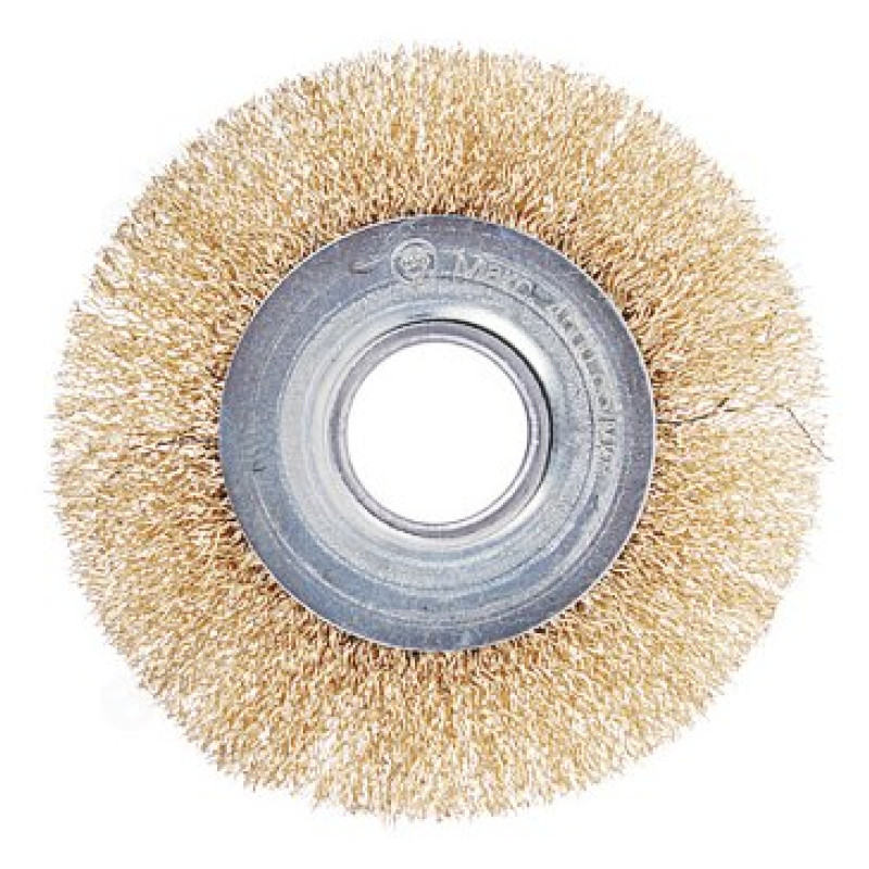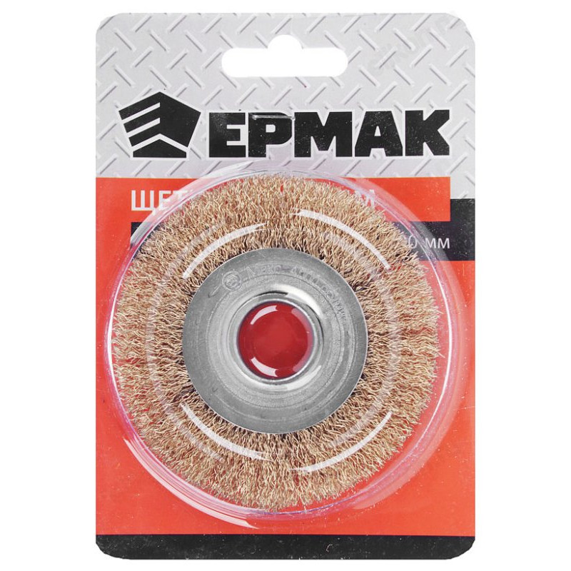 Плоская металлическая щетка ЕРМАК для УШМ 100 мм/22 мм с рабочей поверхностью из латунной проволоки применяется для зачистки металлических поверхностей с целью удаления ржавчины, окалины, заусенцев, шероховатостей, застарелого известкового налета и сглаживания сварных швов. Работает бережно и эффективно, не повреждая поверхности. Щетка не подвержена коррозии и хорошо противостоит износу.