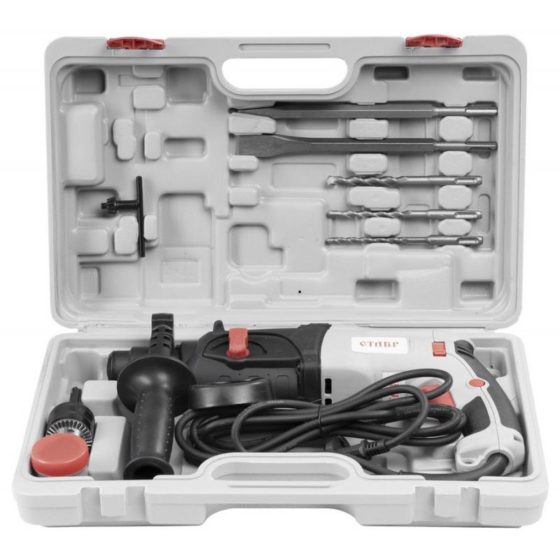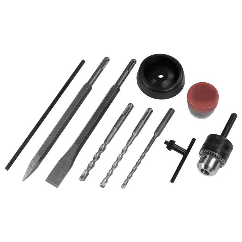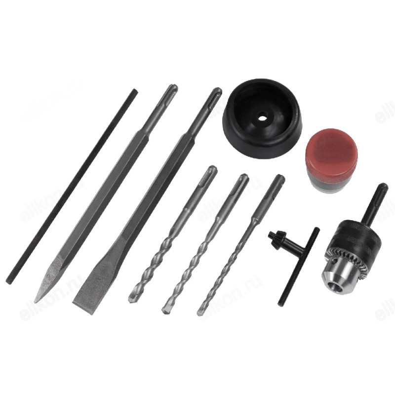 В комплекте: Долото, дополнительная рукоятка, дополнительный комплект щеток, кейс, ключ, ключевой патрон, ограничитель глубины сверления, пыльник, упаковка смазки