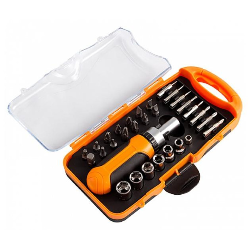биты 25мм - 13шт, адаптер, биты прецизионные 28мм - 8шт, торц.головки 6шт, ручка д/отвертки-трещотки, пластиковый кейс