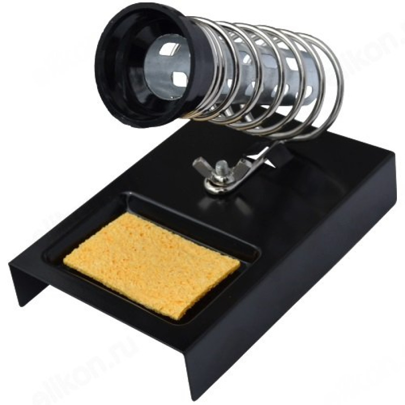 Подставка для паяльника имеет спиралевидный вид подставки с металлической трубкой под паяльник, оснащена дополнительно губкой для чистки жала.