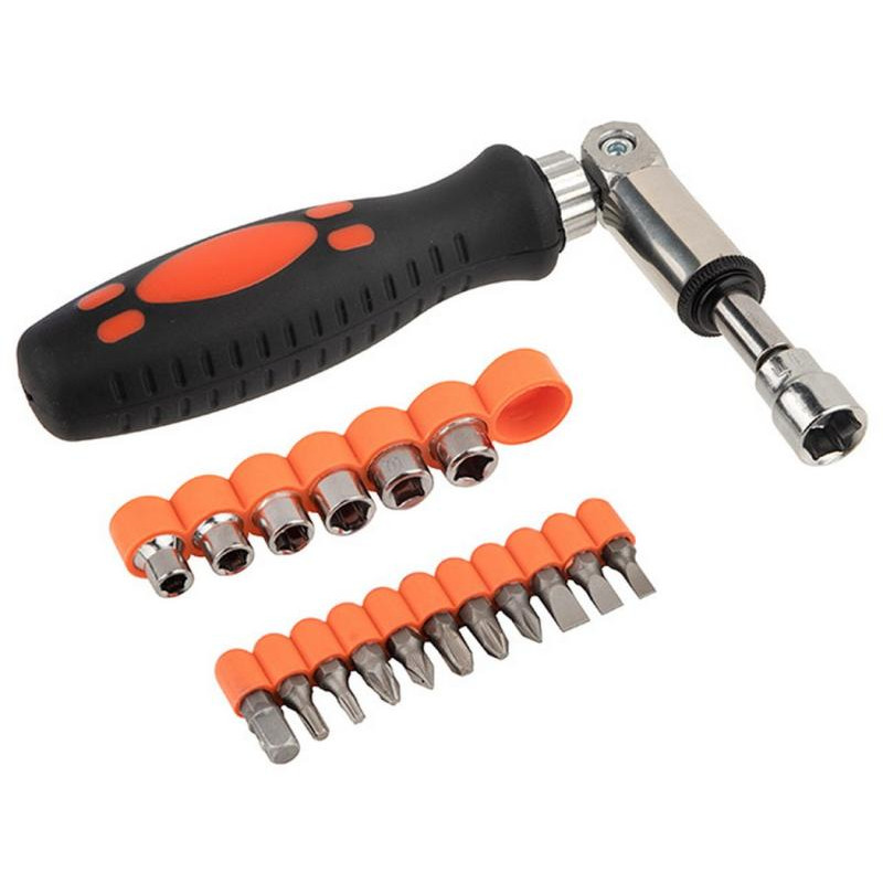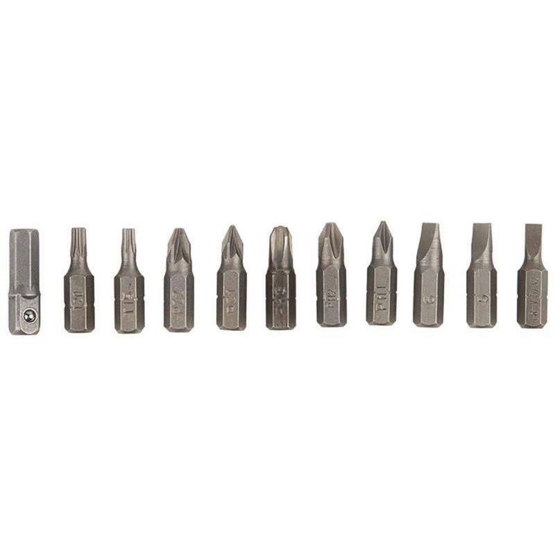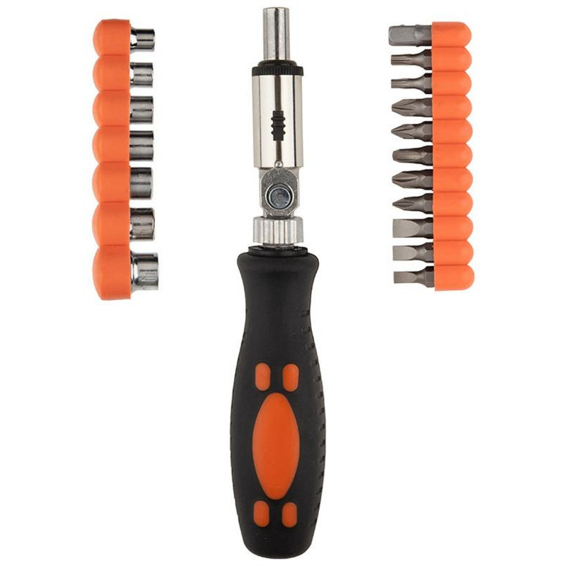 углеродистая сталь/пластмасса, в наборе отвертка реверсивная с шарниром, торцевые головки 7шт (5мм, 6мм, 7мм, 8мм, 9мм, 10мм, 11мм), биты 25мм 10шт (PH1, PH2, PH3, PZ1, PZ2, SL4, SL5, SL6, T15, T20), адаптер 1/4