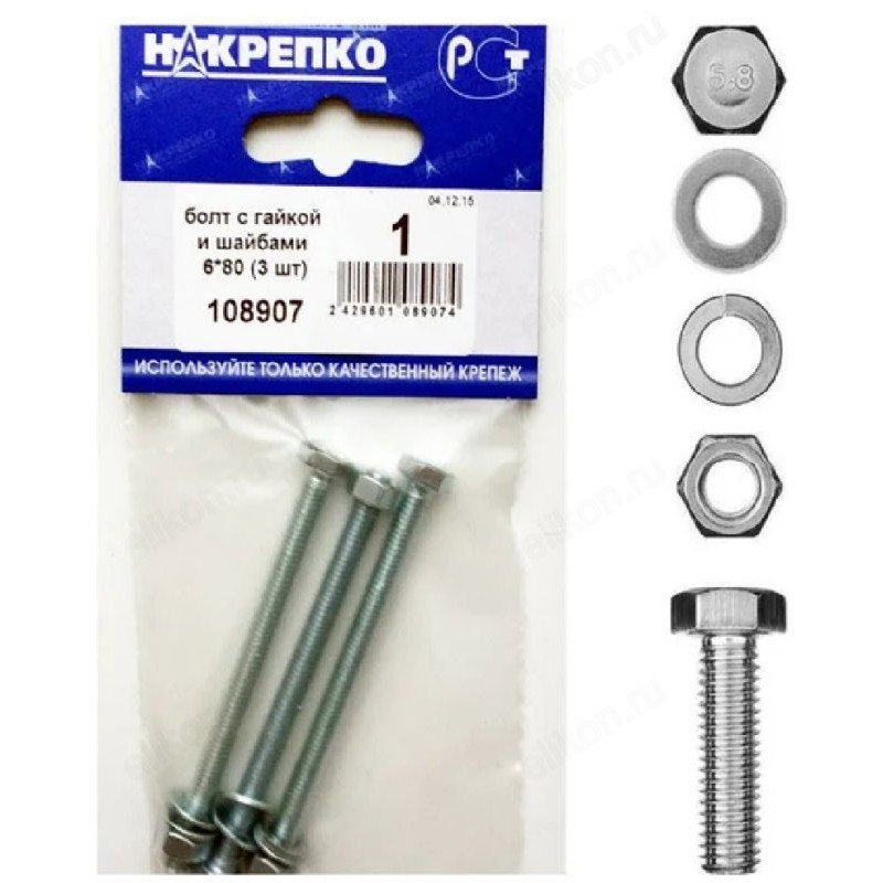Болт с гайкой и шайбами 6*80 " НАКРЕПКО" (3 шт) 108907