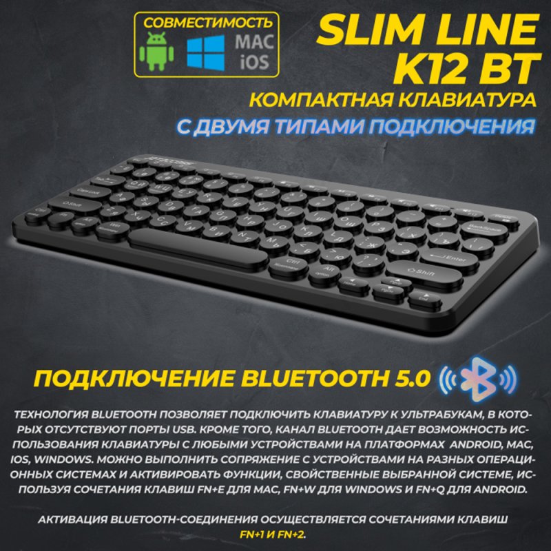 Технология Bluetooth позволяет подключить клавиатуру к ультрабукам, в которых отсутствуют порты USB. Кроме того, канал Bluetooth дает возможность использования клавиатуры с любыми устройствами на платформах Android, Mac, iOS, Windows. Можно выполнить сопряжение с устройствами на разных операционных системах и активировать функции, свойственные выбранной системе, используя сочетания клавиш Fn+E для Mac, Fn+W для Windows и Fn+Q для Android. Активация Bluetooth-соединения осуществляется сочетаниями клавиш Fn+1 и Fn+2.