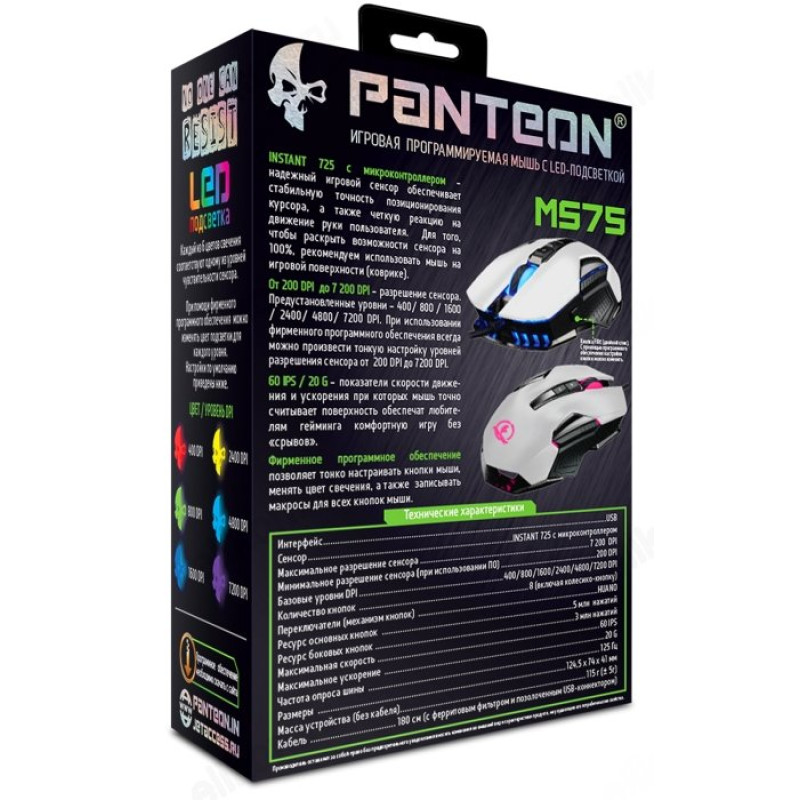 Игровая программируемая мышь PANTEON MS75 белая (200-7200 dpi, 8 кн., LED, ПО, кабель 1.8м, USB)