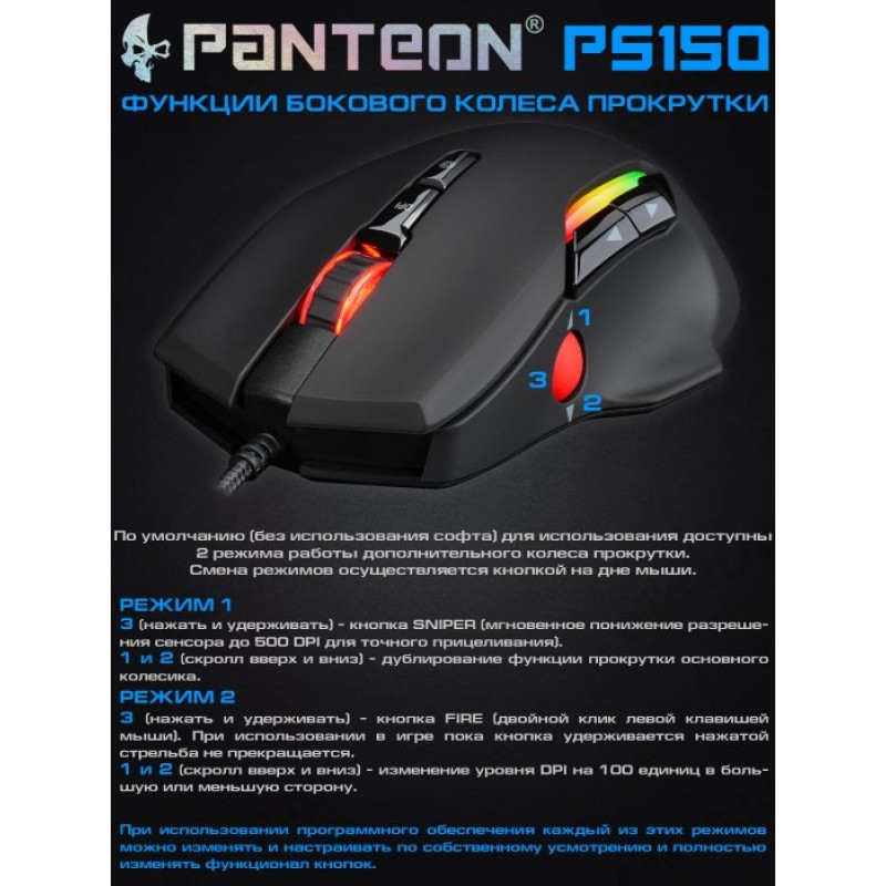 Игровая мышь с дополнительным колесом прокрутки PANTEON PS150 черная(200-6400/12400DPI, 9 кн, LED, USB)