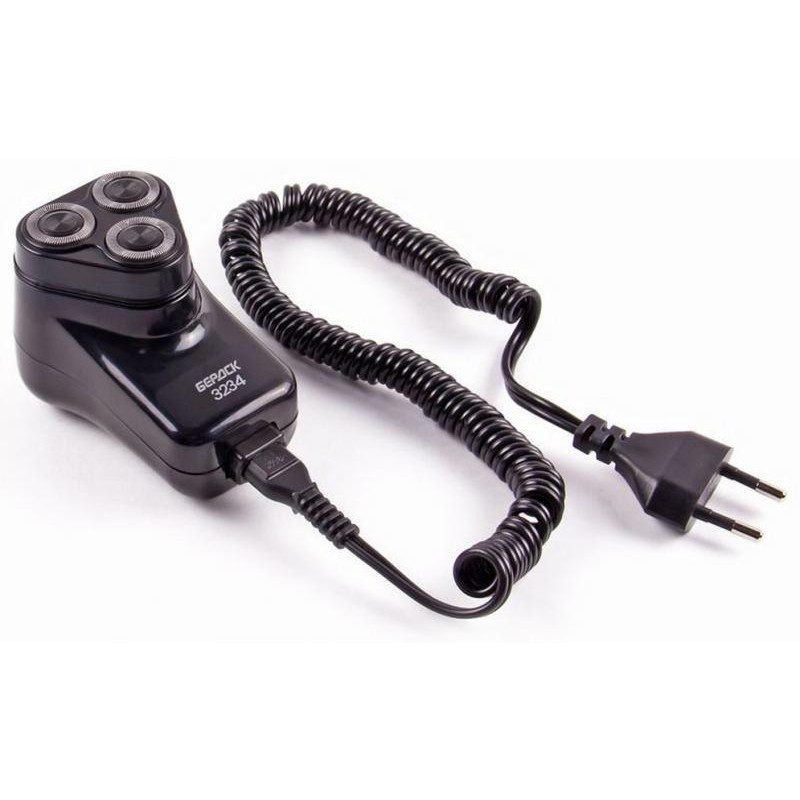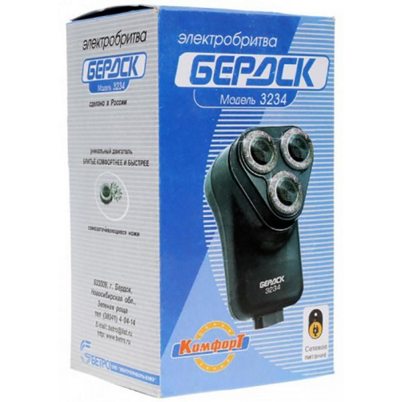 сеть, потребляемая мощность не более 6W, роторная, 3 бреющих головки, сухое бритье, самозатачивающиеся ножи