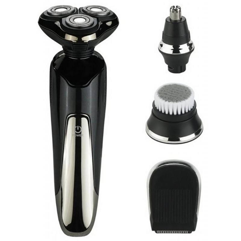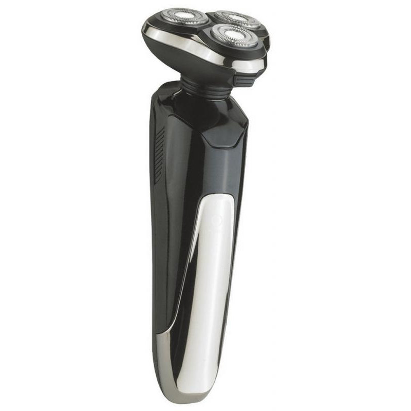 акк/сеть, номинальная потребляемая мощность 5W, роторная, 3 бреющих головки, триммер для бороды и усов, триммер для носа, щеточка для лица, сухое бритье, время зарядки 2ч, влагозащитный корпус, двухдорожечные ножи, плавающие бреющие головки