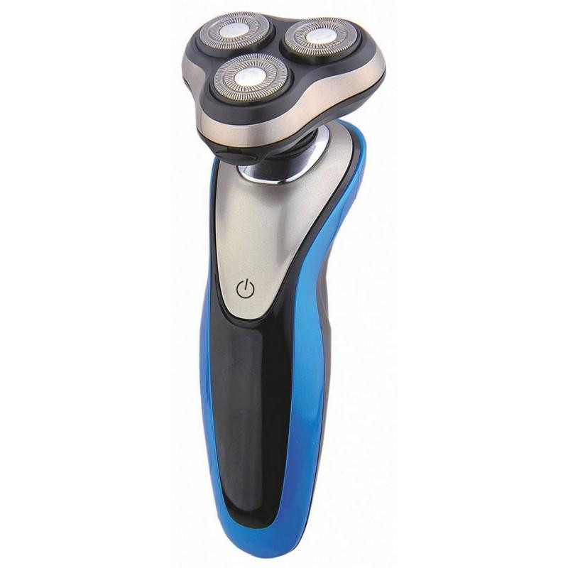 акк, номинальная потребляемая мощность 3W, роторная, 3 бреющих головки, сухое бритье, время зарядки 8ч, двухдорожечные ножи, плавающие бреющие головки
