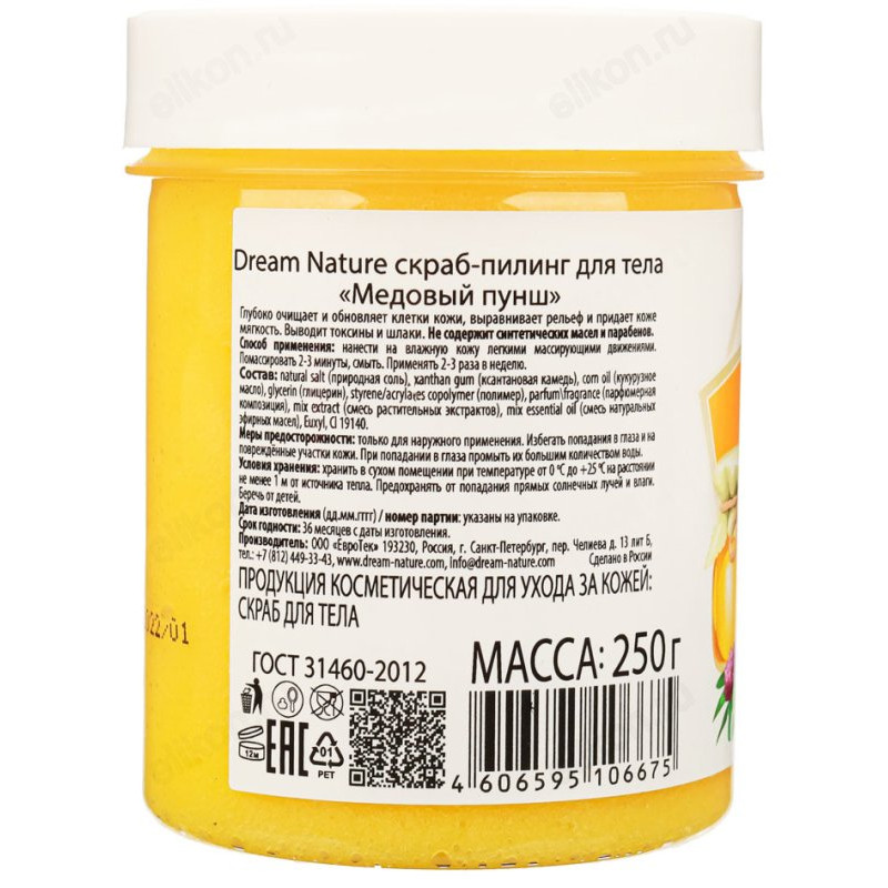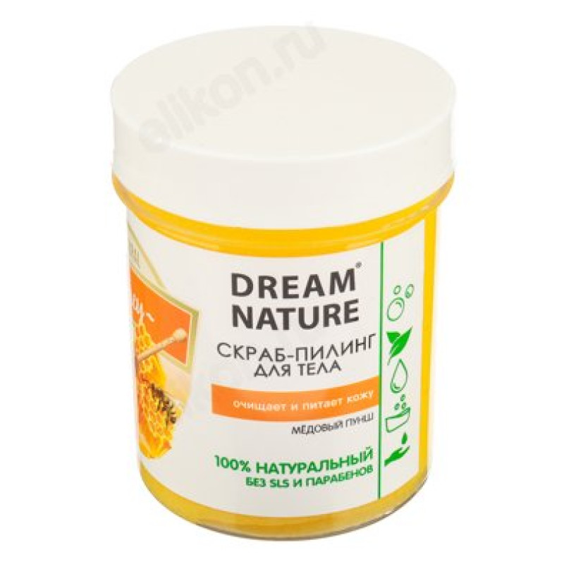 Скраб-пилинг для тела Dream Nature " Медовый пунш" 250 мл очищает и питает кожу, способствует активизации процессов обновления в клетках эпидермиса, выводит шлаки и токсины. Природная соль обладает антисептическим эффектом, а растительные масла и натуральные экстракты питают, восстанавливают и увлажняют кожу, а также обладают успокаивающим эффектом, снимая раздражение. Скраб имеет комфортную текстуру и не оставляет после себя жирности и липкости.