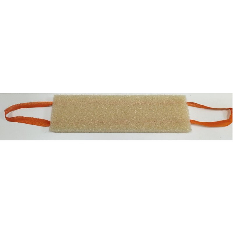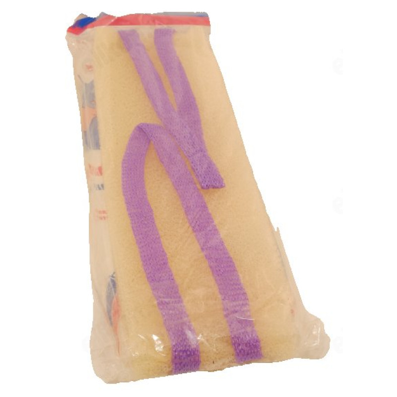 Сплошная жесткая мочалка из крупнопористого поролона с ручками из полипропиленовой нити.