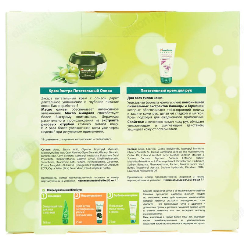 Подарочный набор Himalaya включает питательный крем «Олива» и питательный крем для рук «Лаванда и гарциния». Крема не содержат парабенов и минеральных масел, а активные компоненты глубоко питают, увлажняют и смягчают кожу, даря ей молодость и свежесть. Подходят для применения в любой сезон, не оставляют ощущения липкости на коже. Отличный подарок для женщин на 8 марта, Новый год или на любой другой праздник.