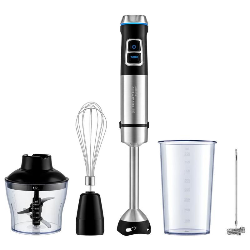 1500Вт, лезвия титан, погружная часть нерж.сталь, турборежим, плавная регулир. скорости, венчик, стакан 800мл, измельчитель 600мл, капучинатор