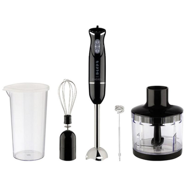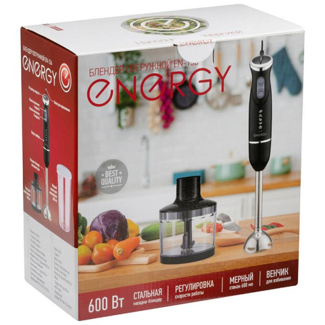 600Вт, нога металл, 2 скорости, Турбо режим, измельчитель 400мл, стакан 600мл с крышкой, венчик, вспениватель молока
