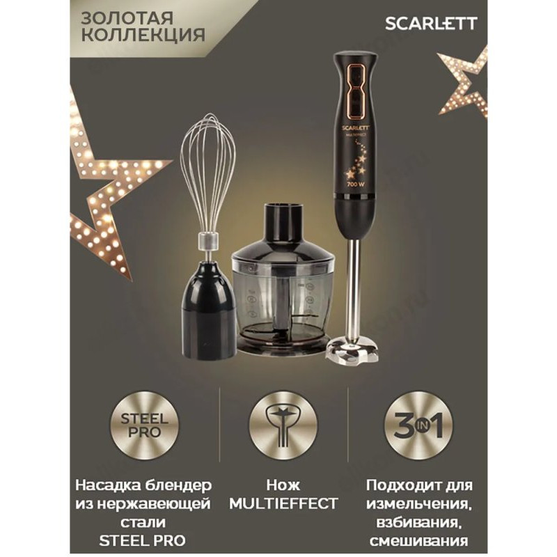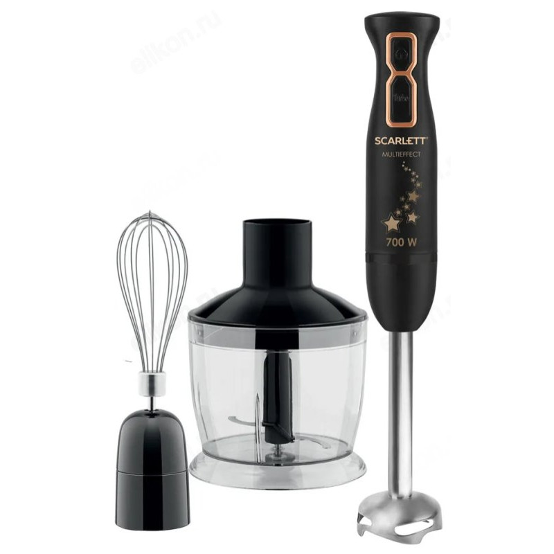 Функциональность блендера обеспечивает продуманный комплект: чаша-измельчитель, погружной блендер, венчик для взбивания.