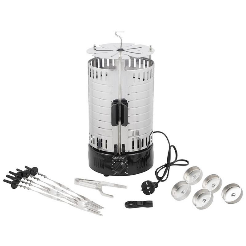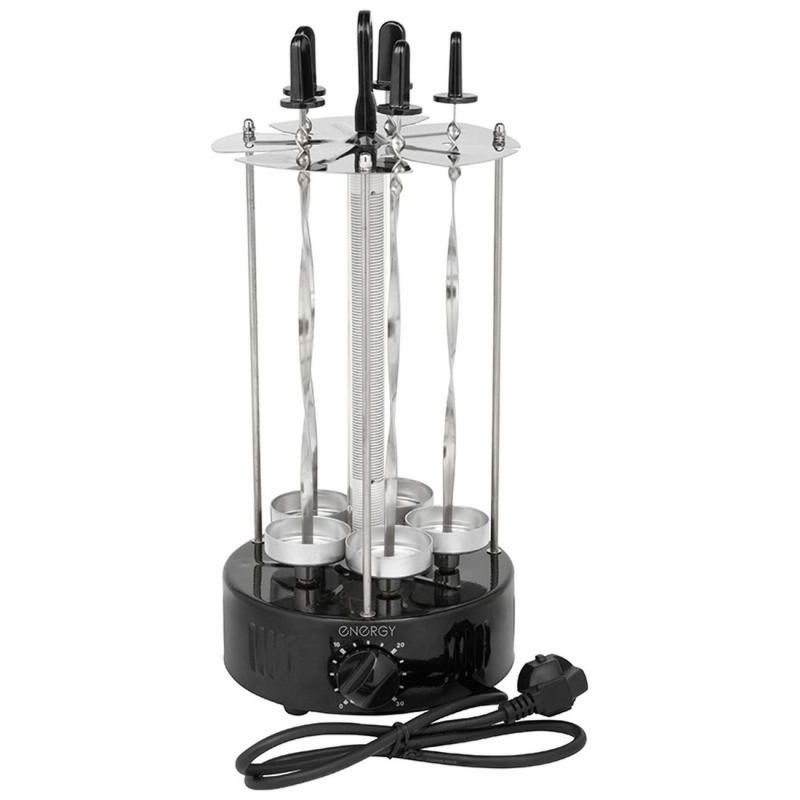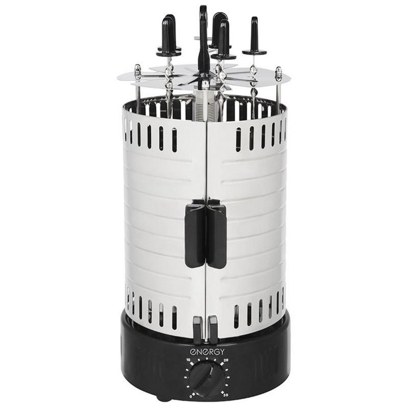 1000Вт, автовращение, 5 шампуров, масса загрузки не более 1кг, время приготовления 15мин, таймер, легкомоющиеся съемные детали