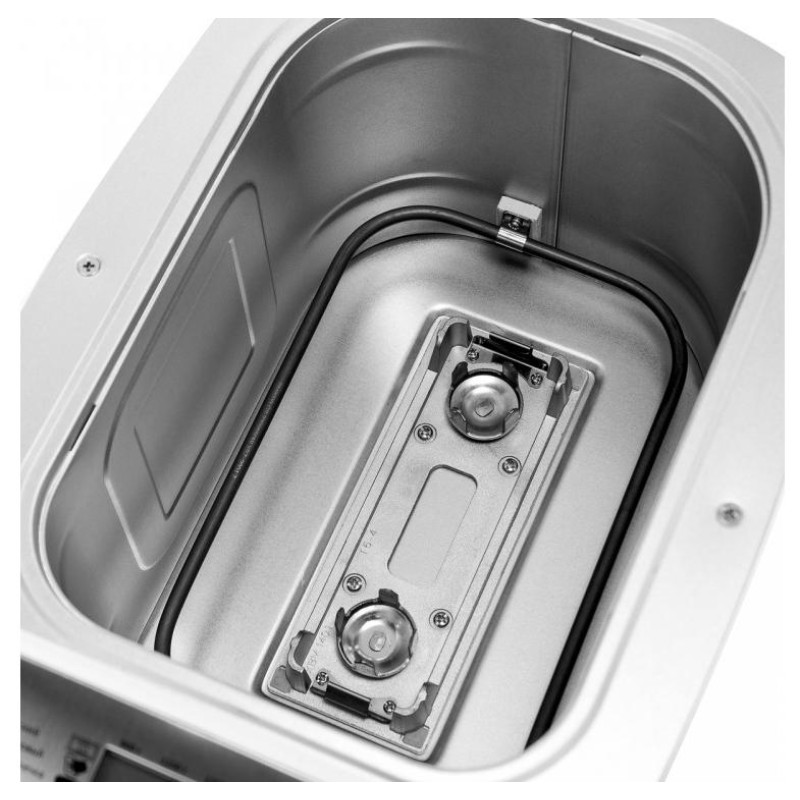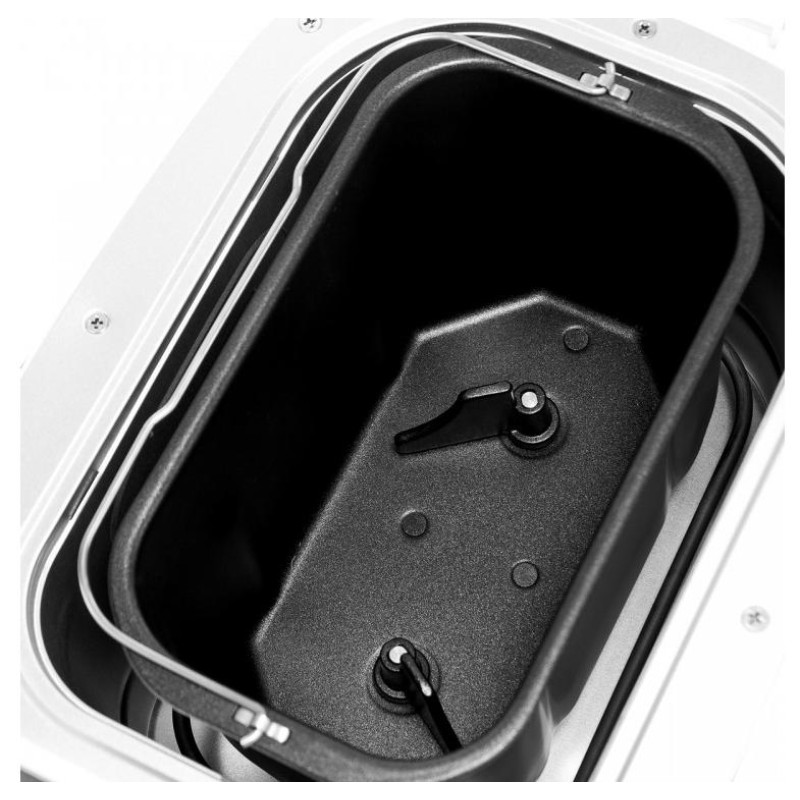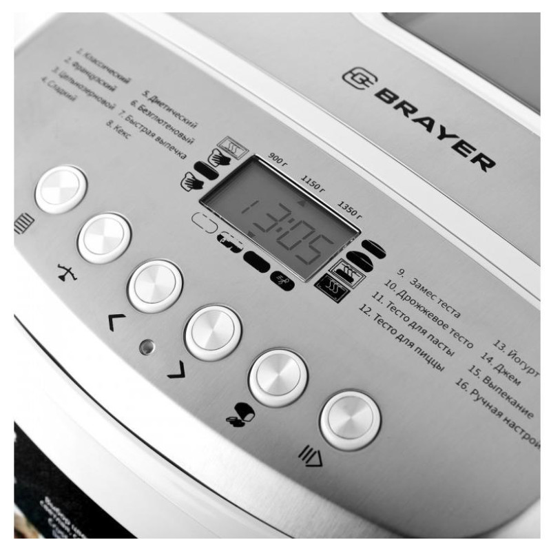 850Вт, 16 программ, выбор размера выпечки 900/1150/1350гр, LCD-дисплей с подсветкой, антиприг.покрытие, 2 месильных лезвия с керамич.покрытием, ложка, стакан, таймер отсрочка 13ч, книга рецептов