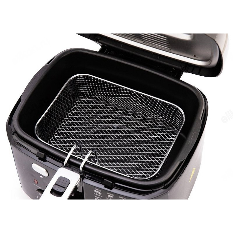 Чаша объёмом 2.5 литра съемная и имеет антипригарное покрытие, благодаря этому еда не пригорает, а слить масло и очистить чашу не составит труда. Складная ручка корзины и крышка с системой безопасного открывания повышают безопасность использования прибора. В крышке расположено смотровое окно для контроля процесса приготовления и съемный фильтр для устранения запаха.