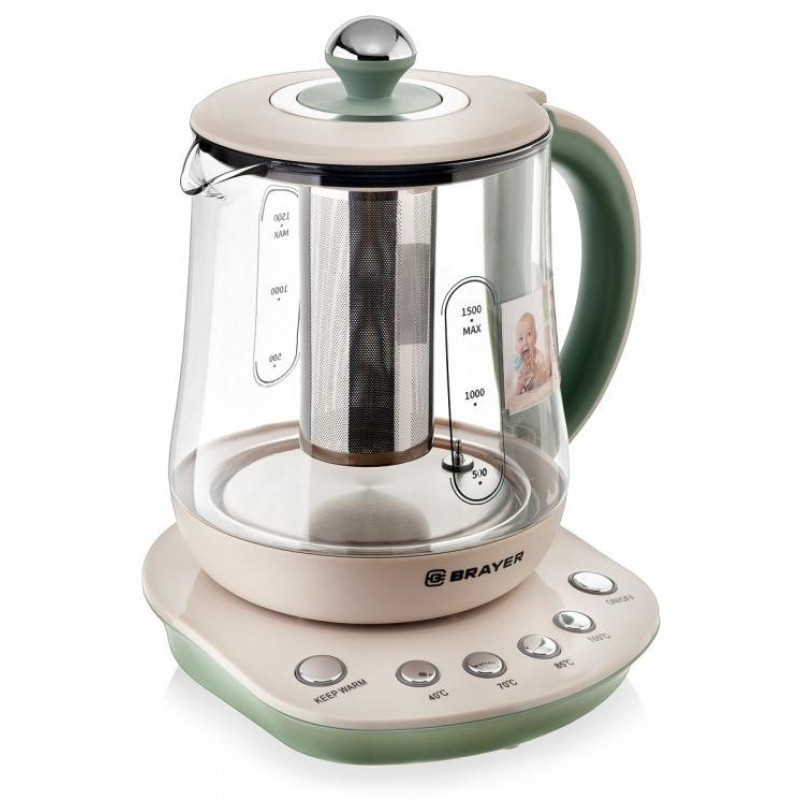 2200Вт, 1.5л, стекло/пластик, электр.управление, ф-и кипячения и подогрева воды (40С-100С), поддержание t до 2ч, ф-я заваривания чая