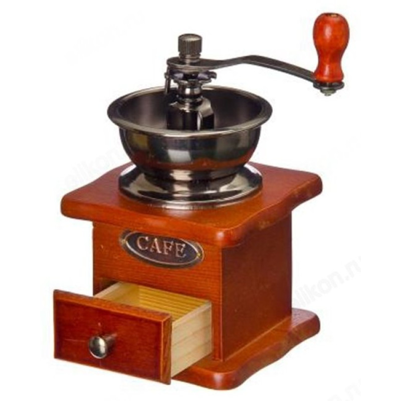 Ручная кофемолка размером 10х10х17,5см с керамическим механизмом и съемной ручкой на деревянном основании с выдвижным ящичком.
