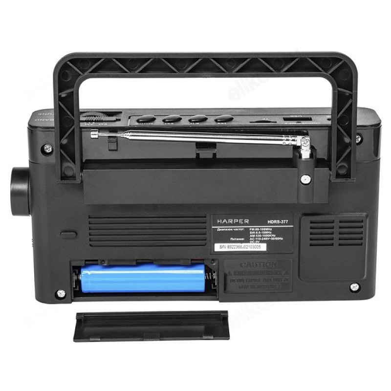 адиоприёмник Harper HDRS-377 – это современное многофункциональное устройство, которое объединяет возможности портативного MP3-плеера, способного воспроизводить музыку со съёмных USB-носителей или с MicroSD/TF карт памяти, а также переносной колонки, которая может принимать аудио-сигналы по проводному (AUX) и беспроводному (Bluetooth) каналу. Harper HDRS-377 работает со всеми диапазонами радиочастот: FM, AM или SW. Питание может подаваться от сети или от встроенного аккумулятора