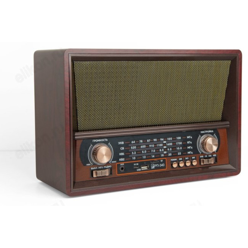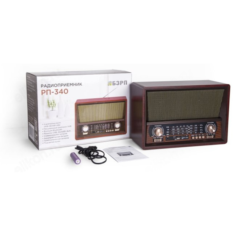 Ретро-дизайн приятно удивит покупателя и навеет ностальгией. Подойдет под любой интерьер, благодаря своему дизайну. Находясь на витрине, привлекает внимание покупателей. Радиоприемник обеспечивает уверенный прием сигнала в УКВ/СВ/КВ1-2 диапазонах. Радиоприемник БЗРП РП-340 оснащен двумя динамиками мощностью 5Вт.