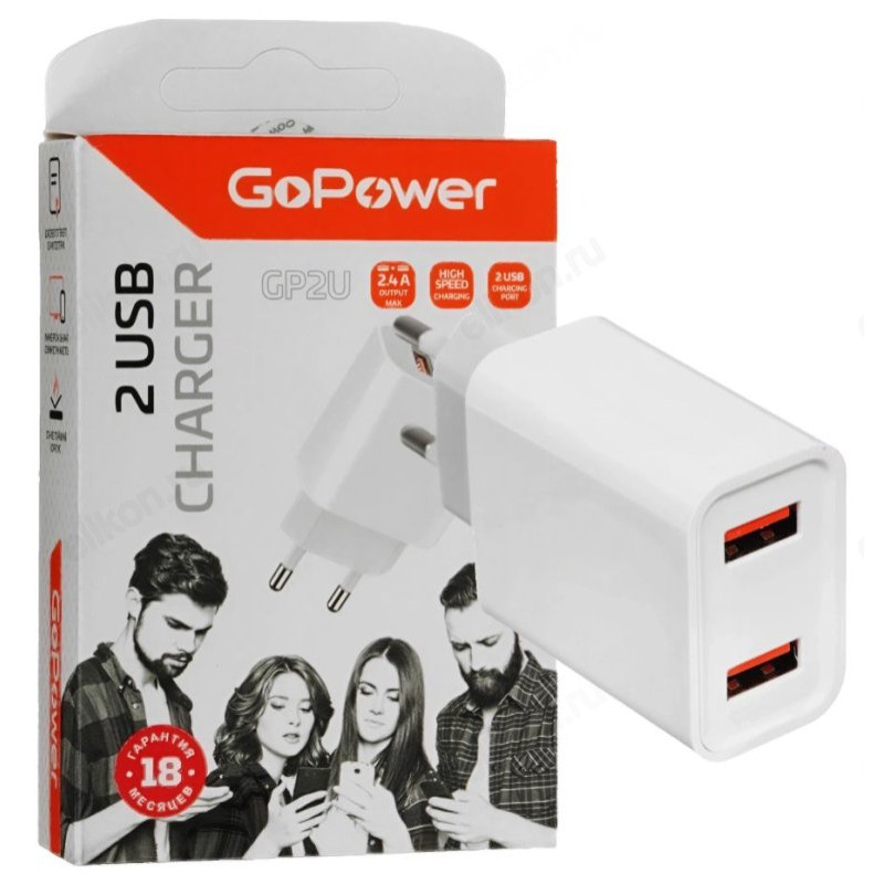 Зарядка сетевая GoPower GP2U 2USB 2.4A 12W 220V белый