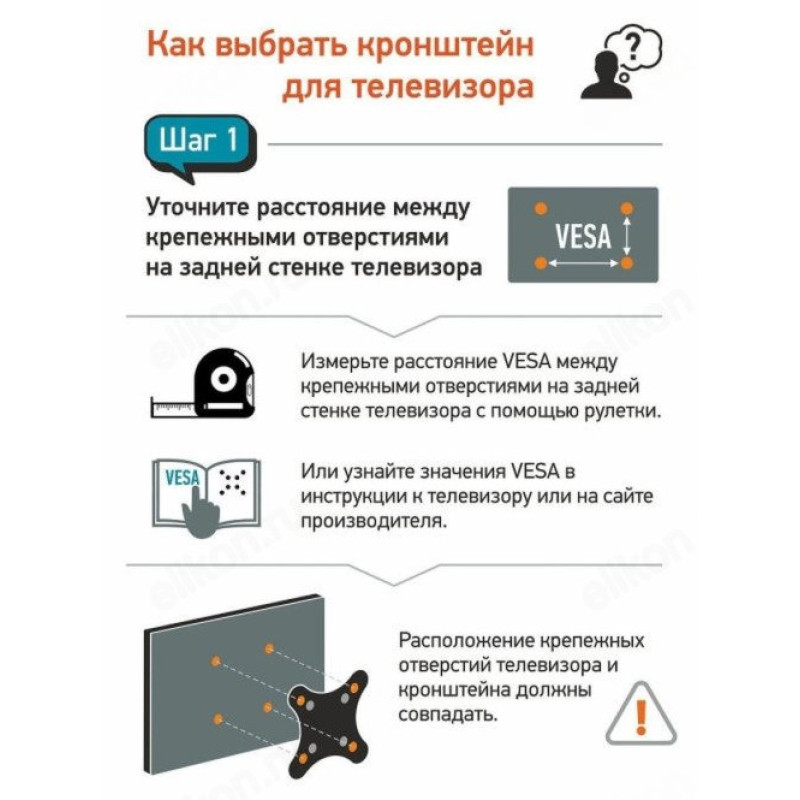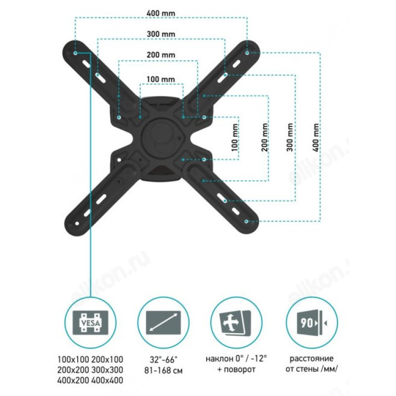 Кронштейн подходит для крепления телевизоров всех марок с диагональю от 32 до 66 дюймов (81 - 168 см) со схемой крепежных отверстий VESA 100х100/200х100/200х200/200х300/300х300/300х400/400х400 мм.
